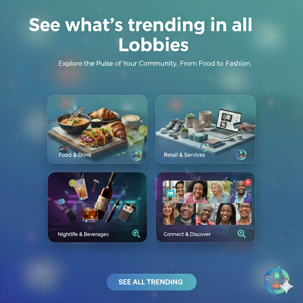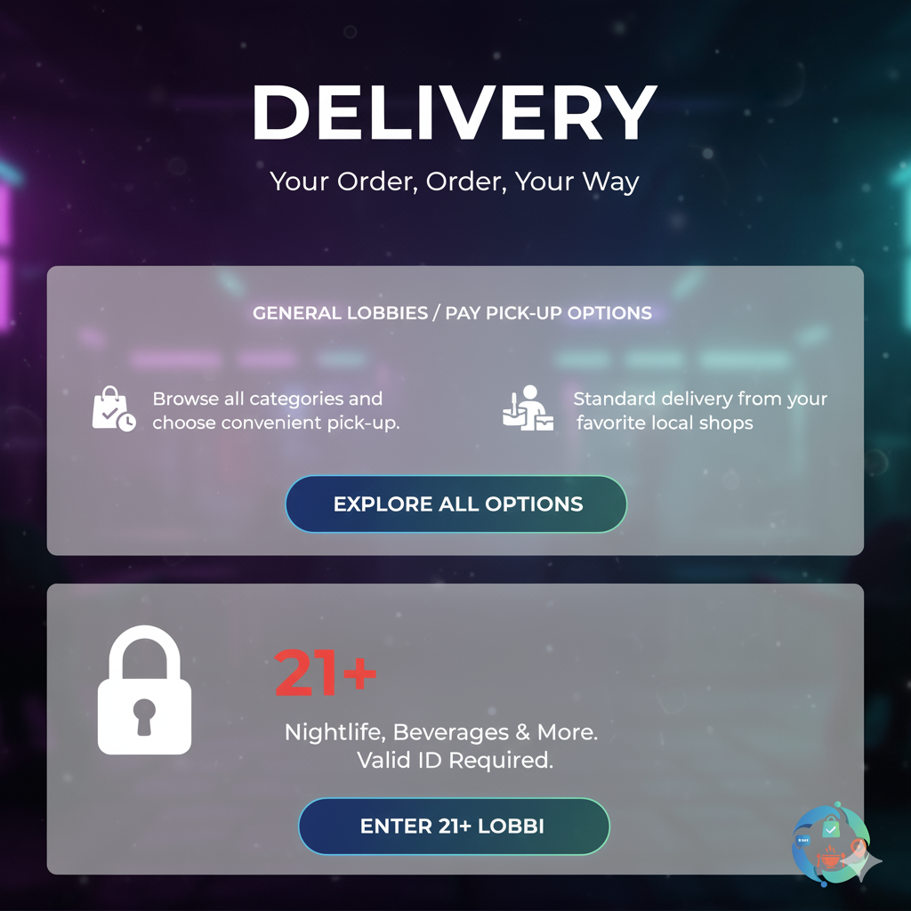 Only one account is needed to access all Lobbies and explore every local business. Must be 21+ to access 21+ lobbies, pay pick up in 21+ Lobbies no charge to create an account.
